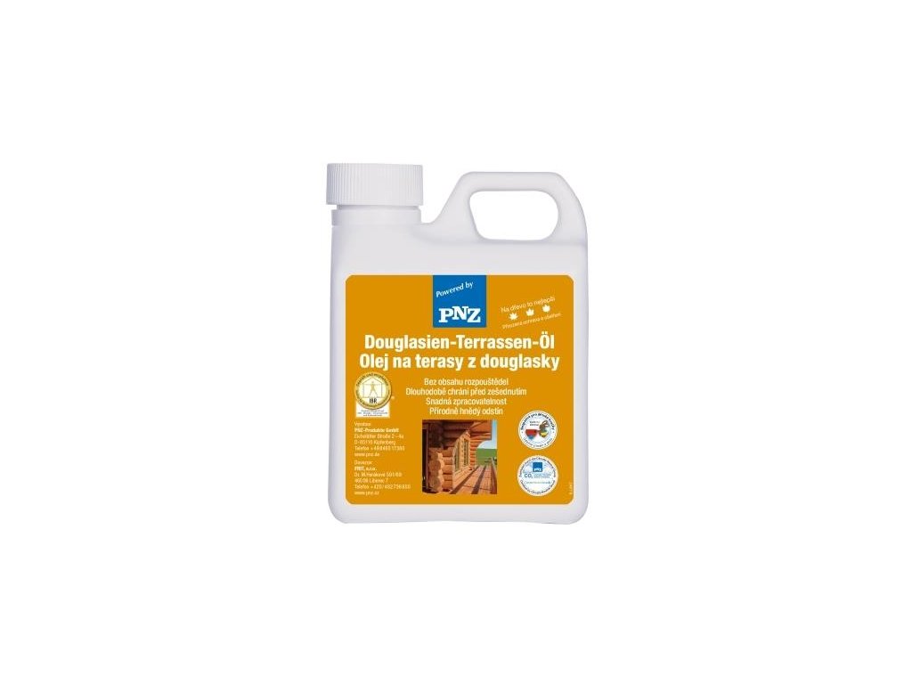 PNZ-Douglasien-Terassen-Öl je jemná olejová emulzia na ochranu a ošetrenie duglasky, smrekovca, tvrdého dreva a exotických drevín. Je vyrobená z prírodných emulgovaných olejov špeciálne vyvinutých pre tieto dreviny. Nanesená povrchová impregnácia zvyšuje odolnosť a predlžuje používanie ošetrených podkladov. PNZ-Douglasien-Terassen-Öl má mliečnu farbu, po zaschnutí je prirodzene hnedý. Vytvára vysoko vodoodpudivý povrch odolný voči poveternostným vplyvom a UV žiareniu. Rozkladá sa veľmi pomaly, a tak poskytuje dlhodobú ochranu proti zošednutiu.